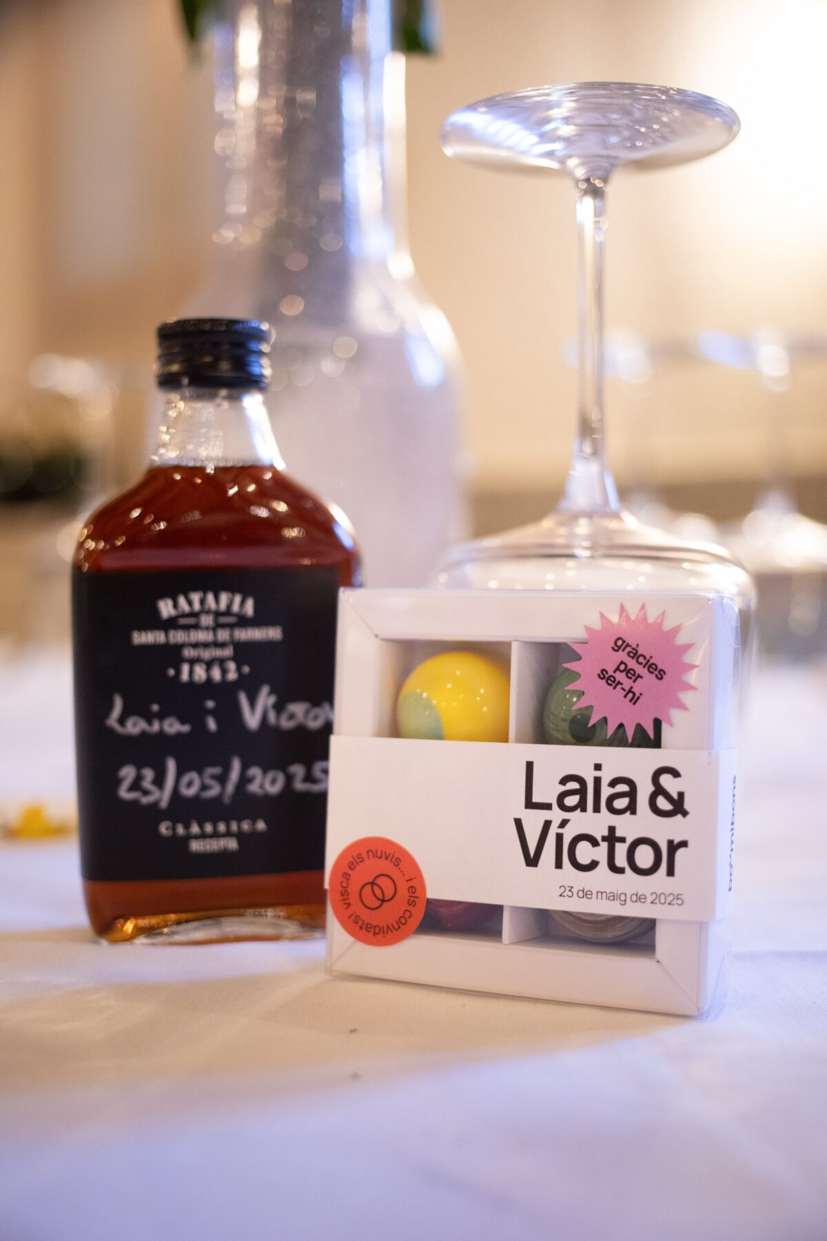 És el regal perfecte per a casaments amb ànima i personalitat. Es pot personalitzar el faldó de la caixa amb els noms i la data, i, si voleu, també el bombó, creant sabors o dissenys exclusius per al vostre gran dia.